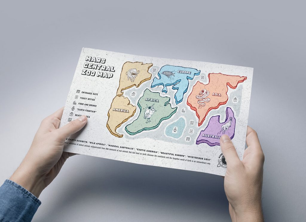 Conceptual branding for Mars Central Zoo. The zoo exhibits extinct animals from Earth, which, after reconstructing their DNA, were restored and readjusted to the living conditions of Mars.